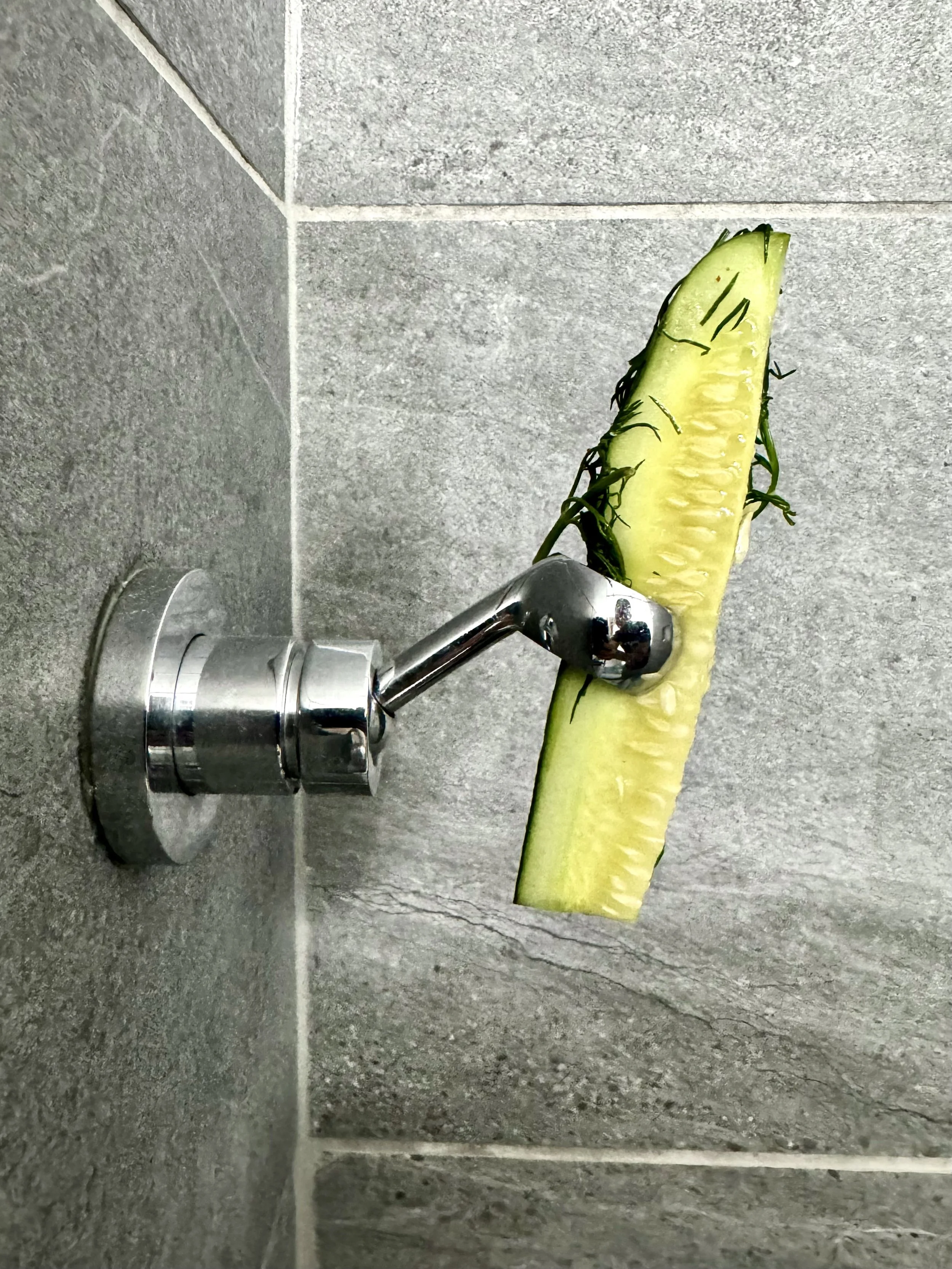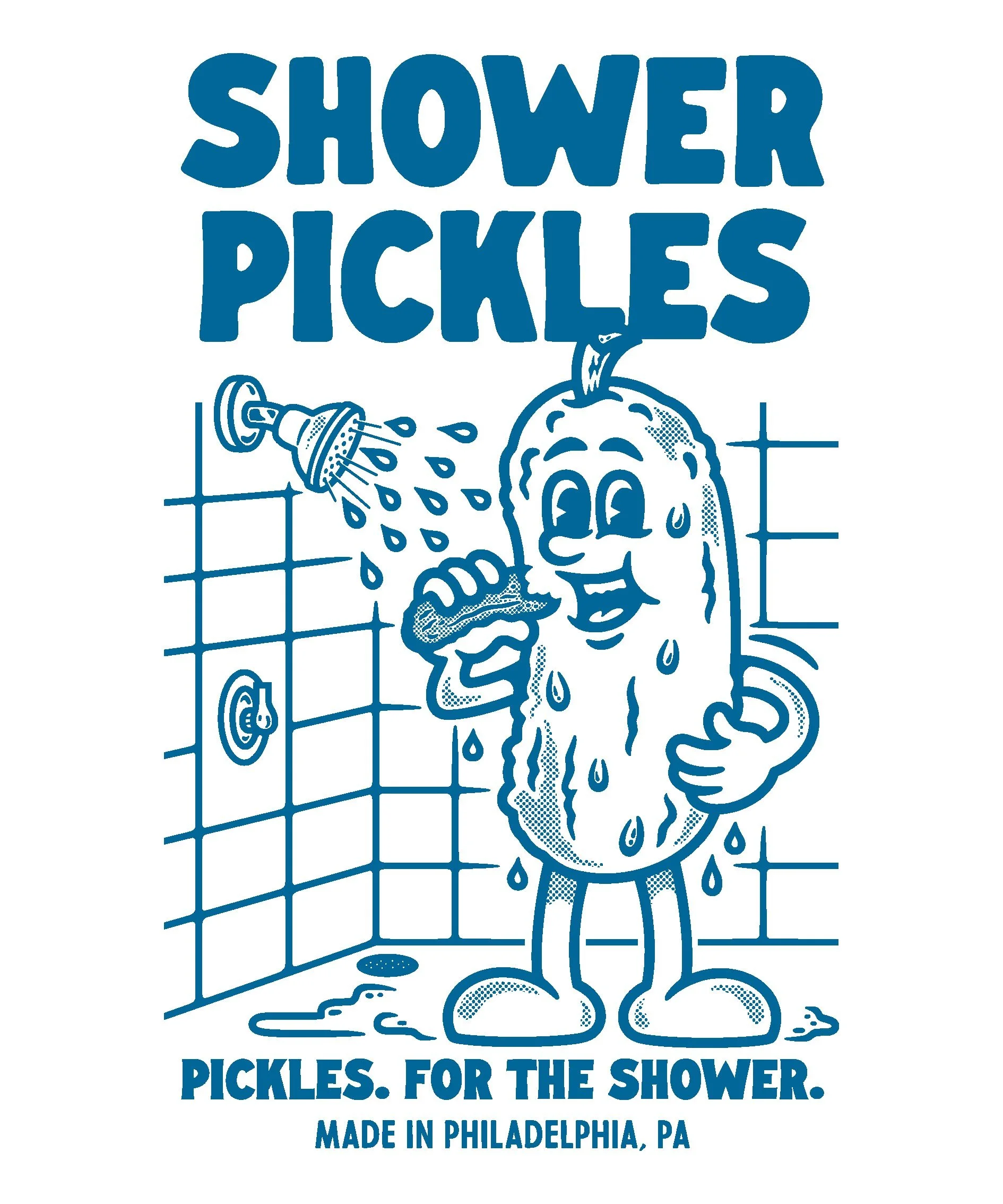 Shower Pickles are made in Philadelphia by Ascher. We use real cucumbers harvested by farmers. The brine is made of a secret formula (if you know the secret handshake, we'll tell you the formula). The pickles are chilled in a refrigerator next to the tofu. Shower Pickles are best enjoyed in the shower. Or in a bathtub. Or in a hot tub. Do you have a hot tub? Can we come sit in it?